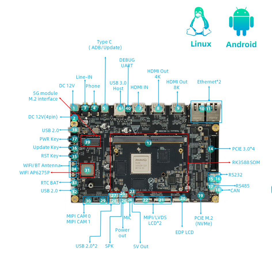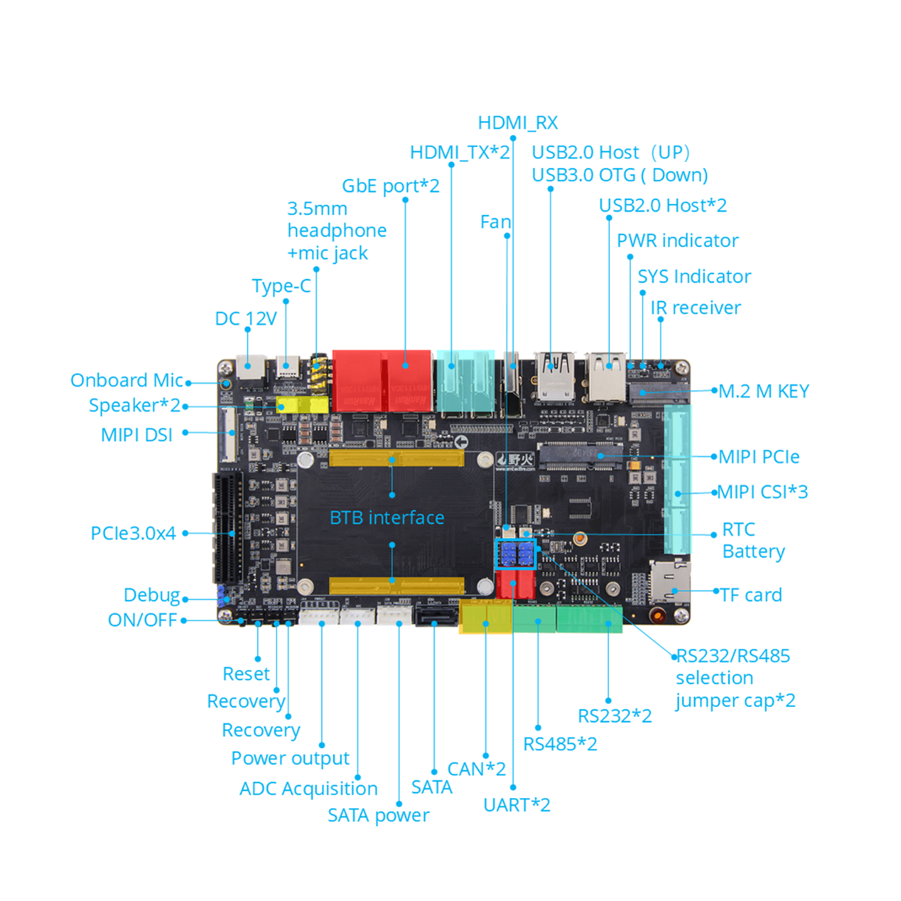 • RK3588 SBC-Vorteile: Im Vergleich zu Raspberry Pi-Produkten bietet das RK3588-Entwicklungsboard eine überlegene Leistung, umfangreichere Schnittstellen und leistungsfähigere Multimedia-Verarbeitungsfunktionen, wodurch es besser für KI- und Industrieanwendungen geeignet ist.